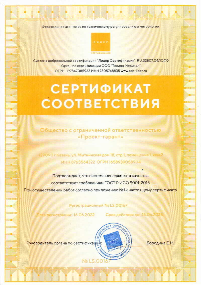 Основной сертификат соответствия с голограммой, который вы будете предъявлять партнёрам и клиентам.